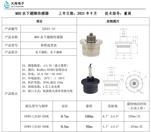 產品選型:綜上所述,經和客戶、公司技術溝通交流后,產品選用制造商為:福州大禹電子科技有限公司定制生產的:分體式水下避障傳感器(10波束電路板),接4路探頭(和電路板做快插連接,200KHz探頭,每只探頭1.5米長線纜),電路板集成到水下機器人內部做好防水封裝,配50米線纜,線纜從機器人頂部穿出來防水封裝,另一端做快插接頭和手持式顯示主機或電腦上位機軟件顯示出前、后、左、右分別的距離值和水下溫度;